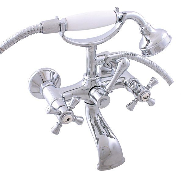 Vodovodní baterie vanová nástěnná s vidlicí na odkládání sprchy a se sprchou.