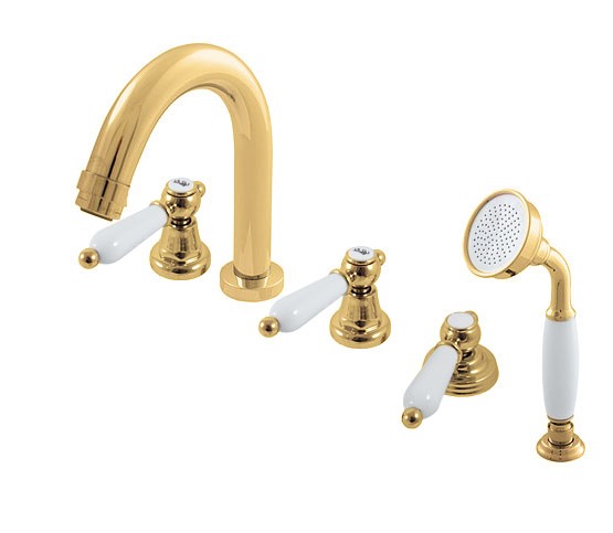 Vodovodní baterie vanová stojánková pětiotvorová s keramickým přepínačem, samonavíjecí sprchou a 2m hadicí.