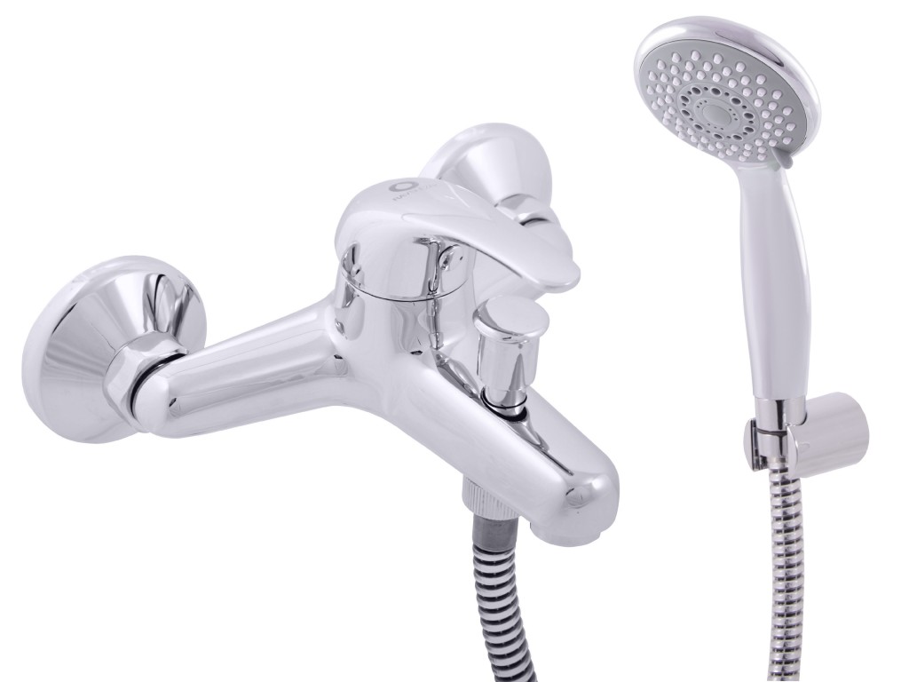Vodovodní baterie vanová nástěnná se sprchou a pevným držákem.