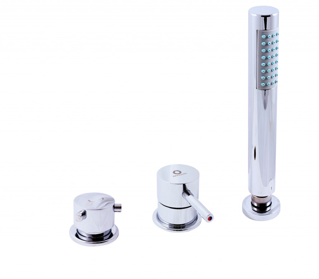 Vodovodní baterie vanová stojánková tříotvorová s keramickým přepínačem, samonavíjecí 2m hadicí a sprchou, pro napouštění přes přepad sifonu.
