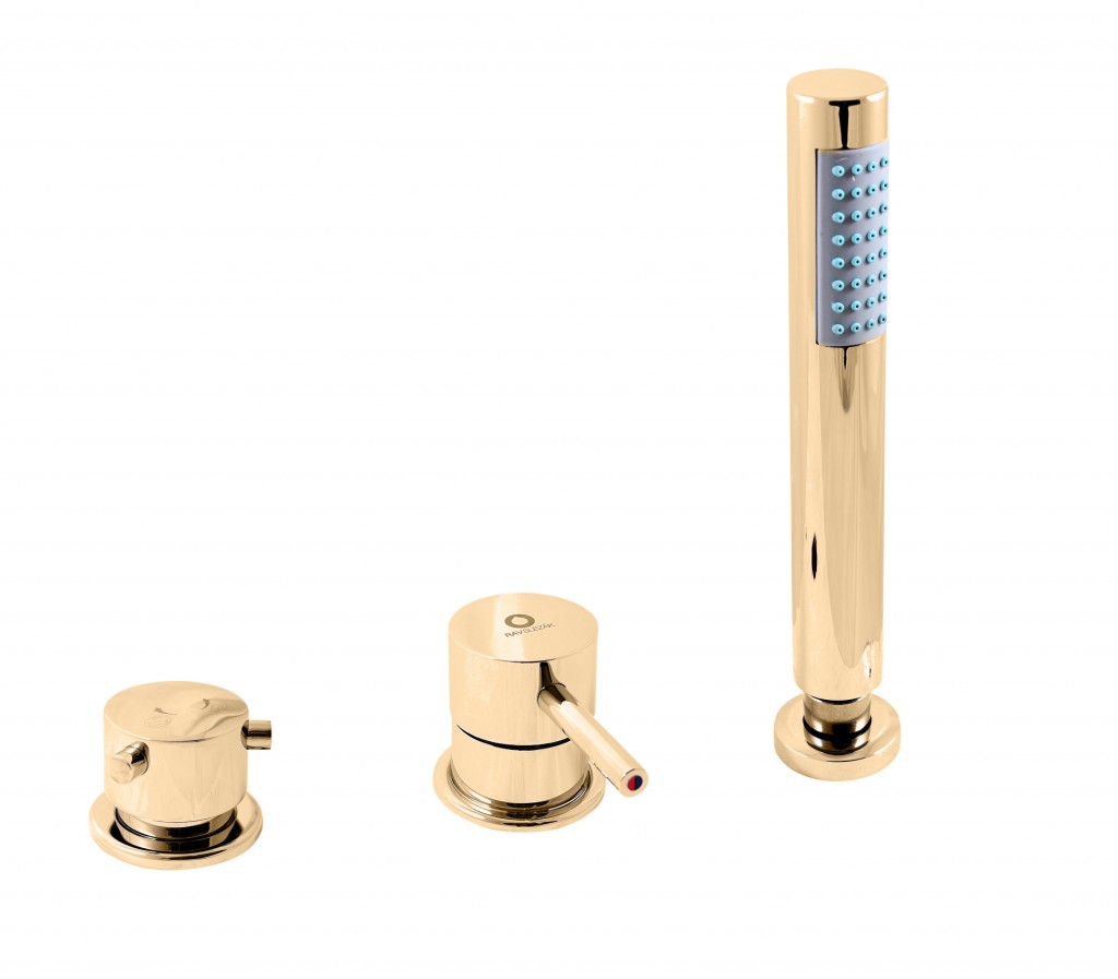Vodovodní baterie vanová stojánková tříotvorová s keramickým přepínačem, samonavíjecí 2m hadicí a sprchou, pro napouštění přes přepad sifonu.