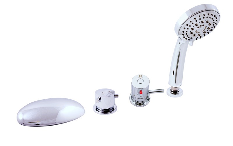 Vodovodní baterie vanová stojánková termostatická čtyřotvorová s keramickým přepínačem, samonavíjecí 2m hadicí a sprchou.