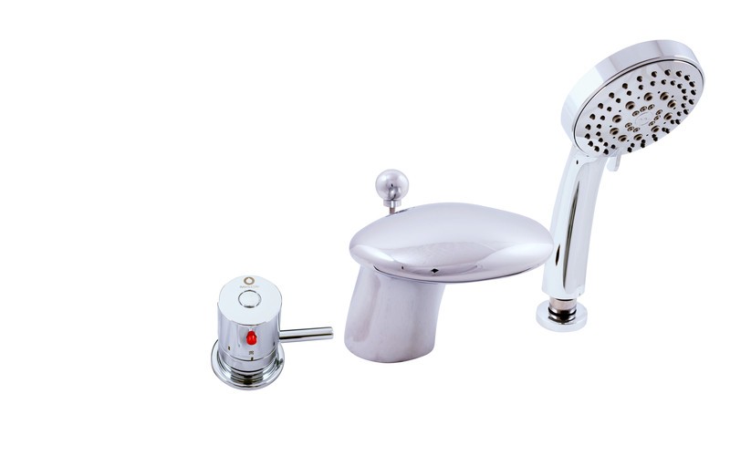 Vodovodní baterie vanová stojánková termostatická tříotvorová s přepínačem ve výtoku, samonavíjecí 2m hadicí a sprchou.