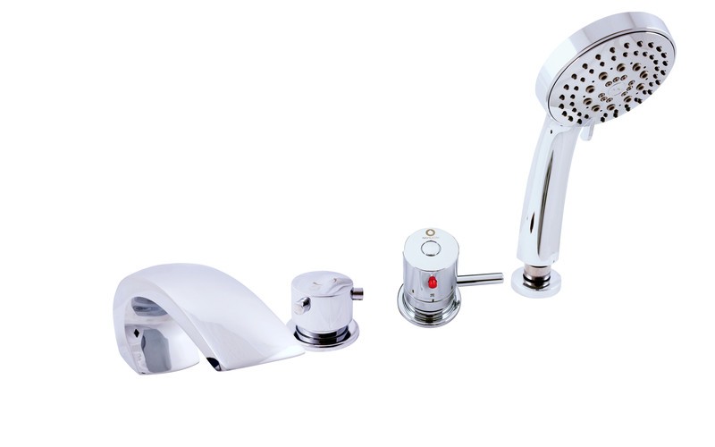 Vodovodní baterie vanová stojánková termostatická čtyřotvorová s keramickým přepínačem, samonavíjecí 2m hadicí a sprchou.