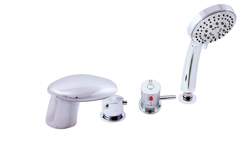 Vodovodní baterie vanová stojánková termostatická čtyřotvorová s keramickým přepínačem, samonavíjecí 2m hadicí a sprchou.