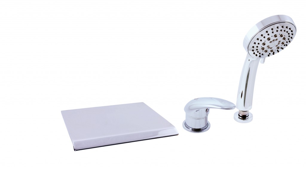 Vodovodní baterie vanová stojánková tříotvorová s přepínačem v mixu, samonavíjecí sprchou a 2m hadicí.