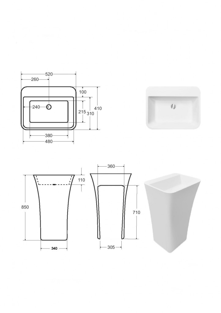 Rozměr volně stojícího umyvadla:- 520 × 410 × 850 mm