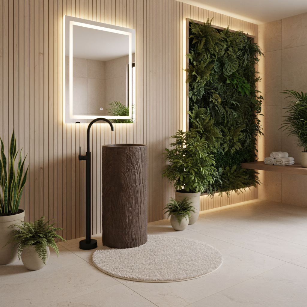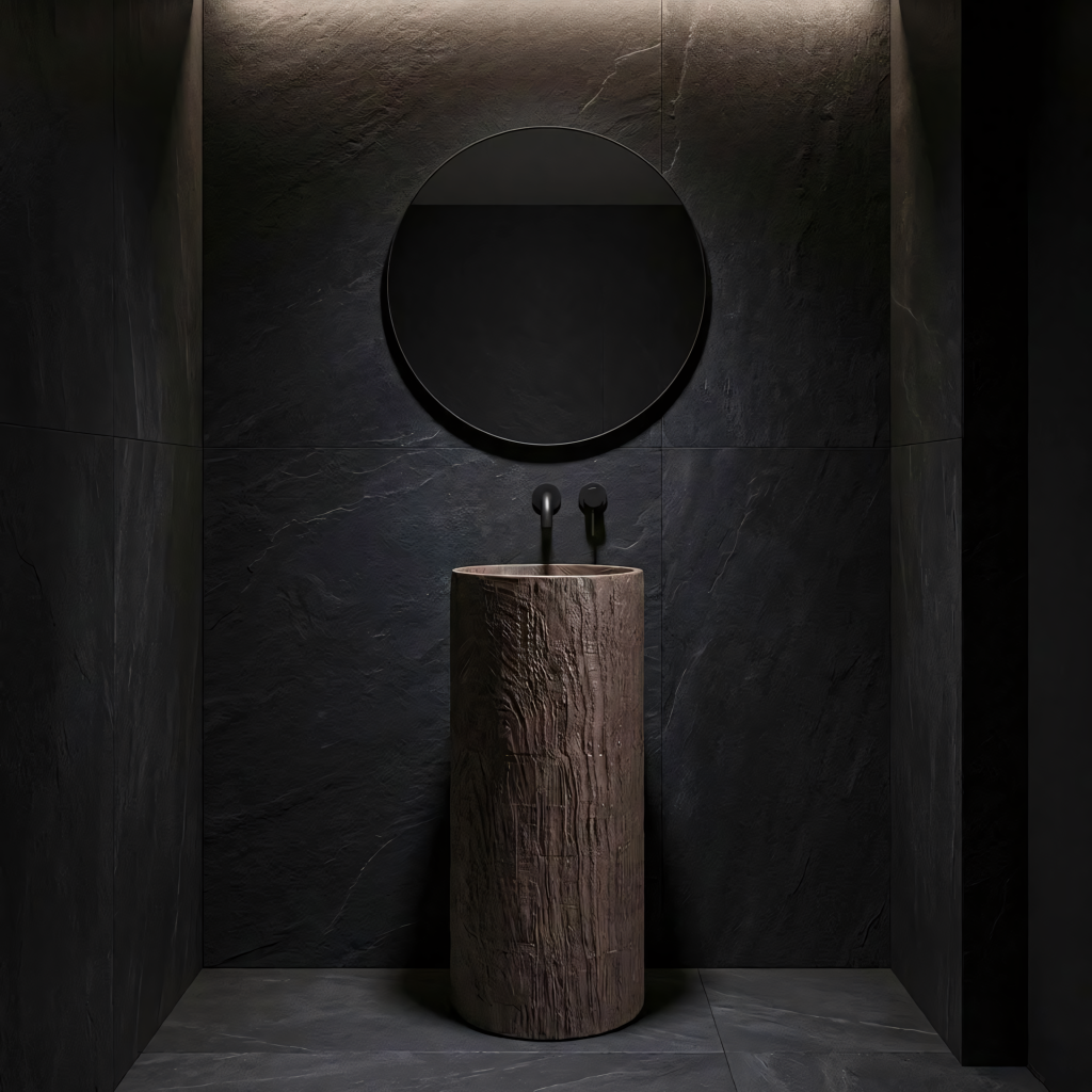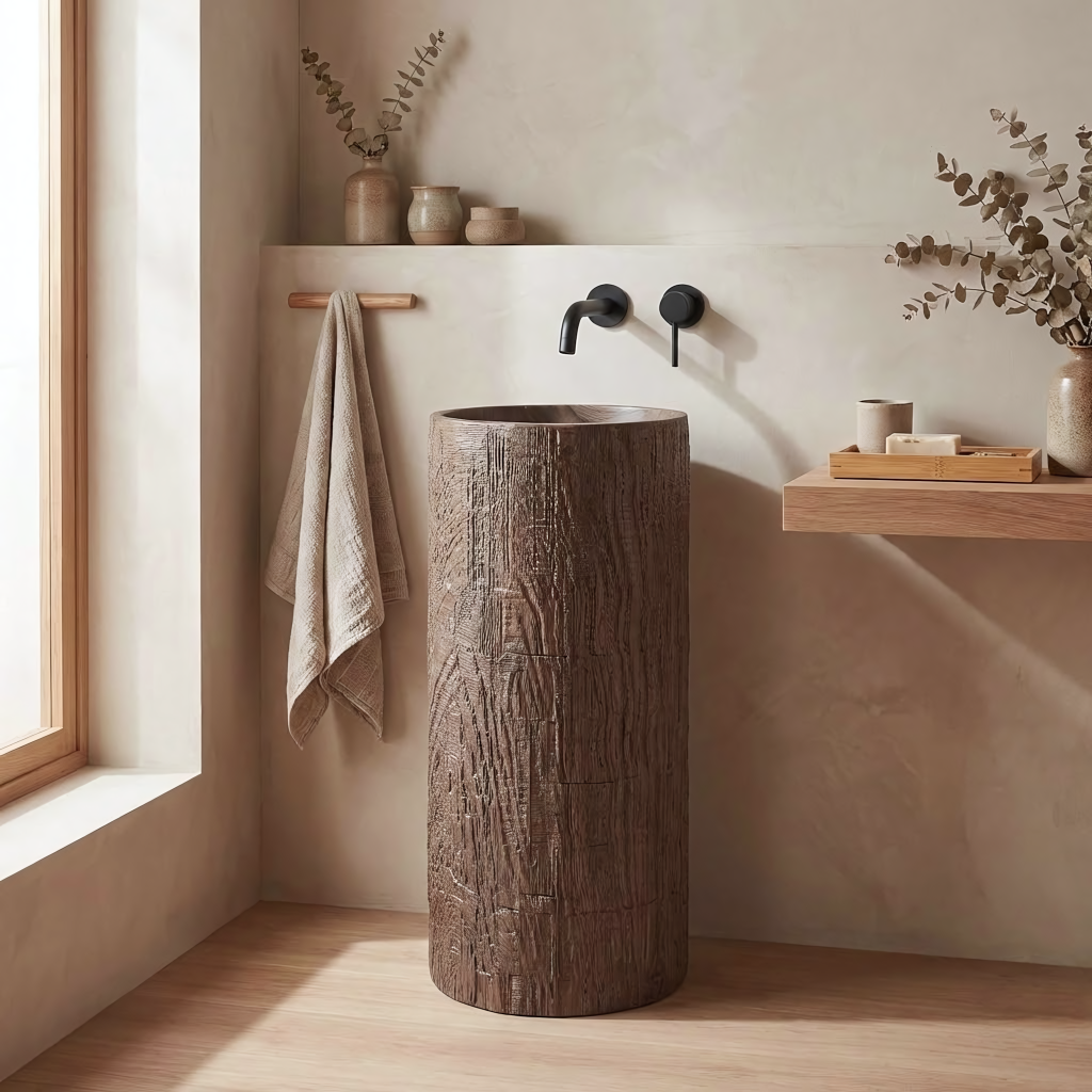 Zvolte volně stojící umyvadlo Rea, které představuje působivé spojení surového designu a moderní technologie. Tento monolitický model z odolného kompozitu Artificial Stone vyniká jedinečnou texturou imitující přírodní kmen stromu. Do koupelny vnese organickou atmosféru a zároveň zachová plnou odolnost a funkčnost syntetických materiálů.Materiál Artificial Stone – vysoce kvalitní umělý kámen (kompozit) s výjimečnou trvanlivostí, odolností proti mechanickému poškození a dokonale hladkým vnitřním povrchem.Imitace přírodního dřeva – vnější struktura věrně napodobuje kůru a kresbu dřeva, díky čemuž má umyvadlo nezaměnitelný rustikální vzhled.Volně stojící konstrukce – jednolitý celek instalovaný přímo na podlahu tvoří výrazný centrální prvek koupelny.Revizní otvor – na zadní straně sloupu je praktický otvor, který umožňuje snadnou montáž sifonu a usnadňuje servisní přístup k instalaci.Odolnost vůči vlhkosti – na rozdíl od pravého dřeva je použitý kompozit zcela odolný vůči vodě a vlhkosti, takže si zachová perfektní vzhled po mnoho let.Volně stojící umyvadlo Rea je skvělou volbou pro milovníky stylu eco, loft i spa – praktická a designová užitková „socha“ do vaší koupelny.