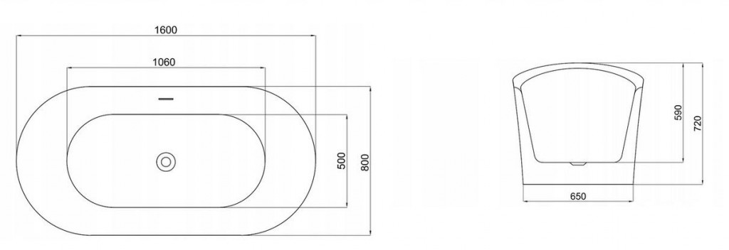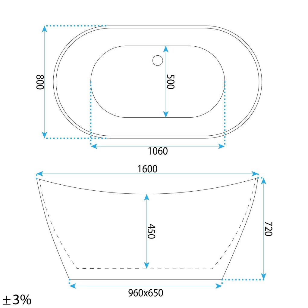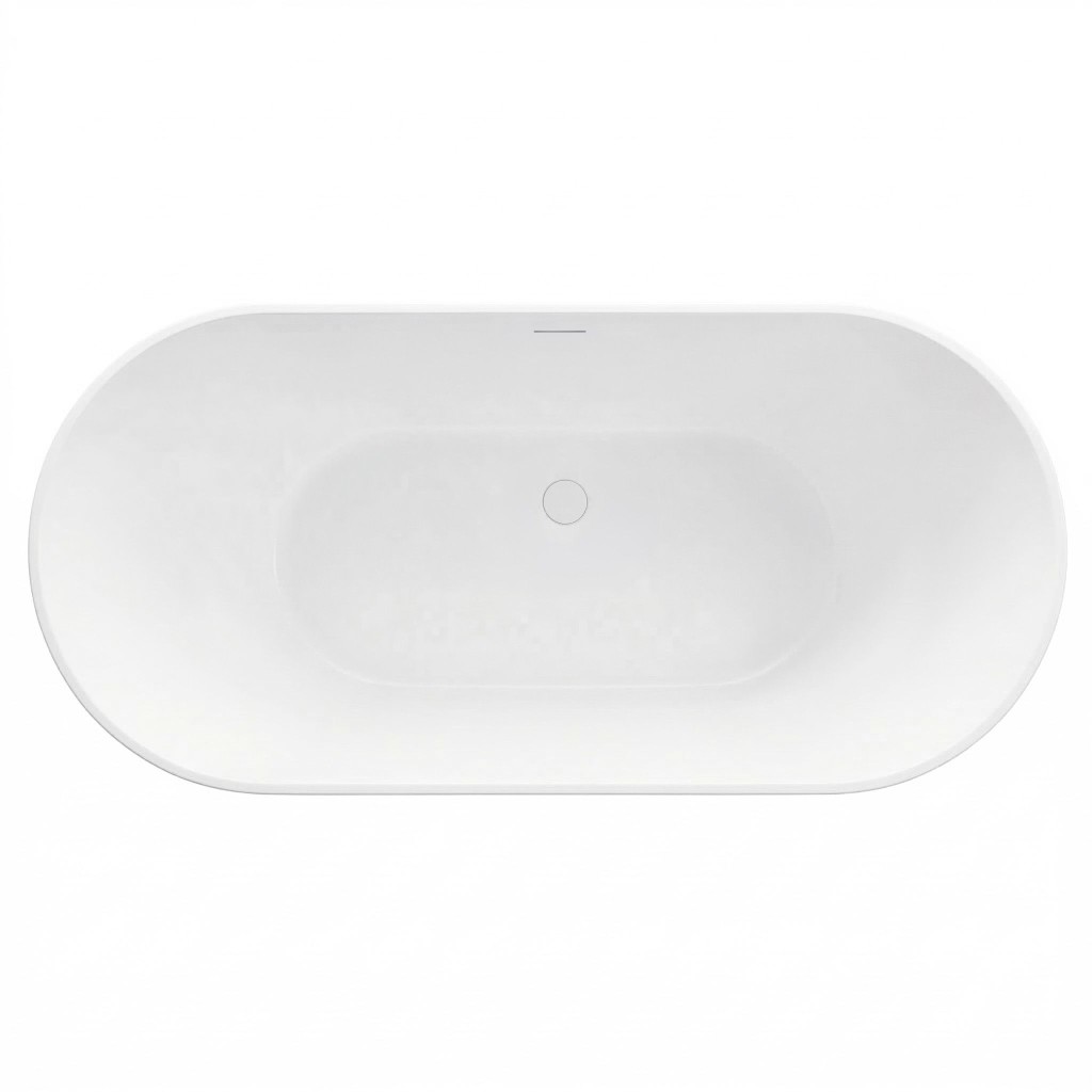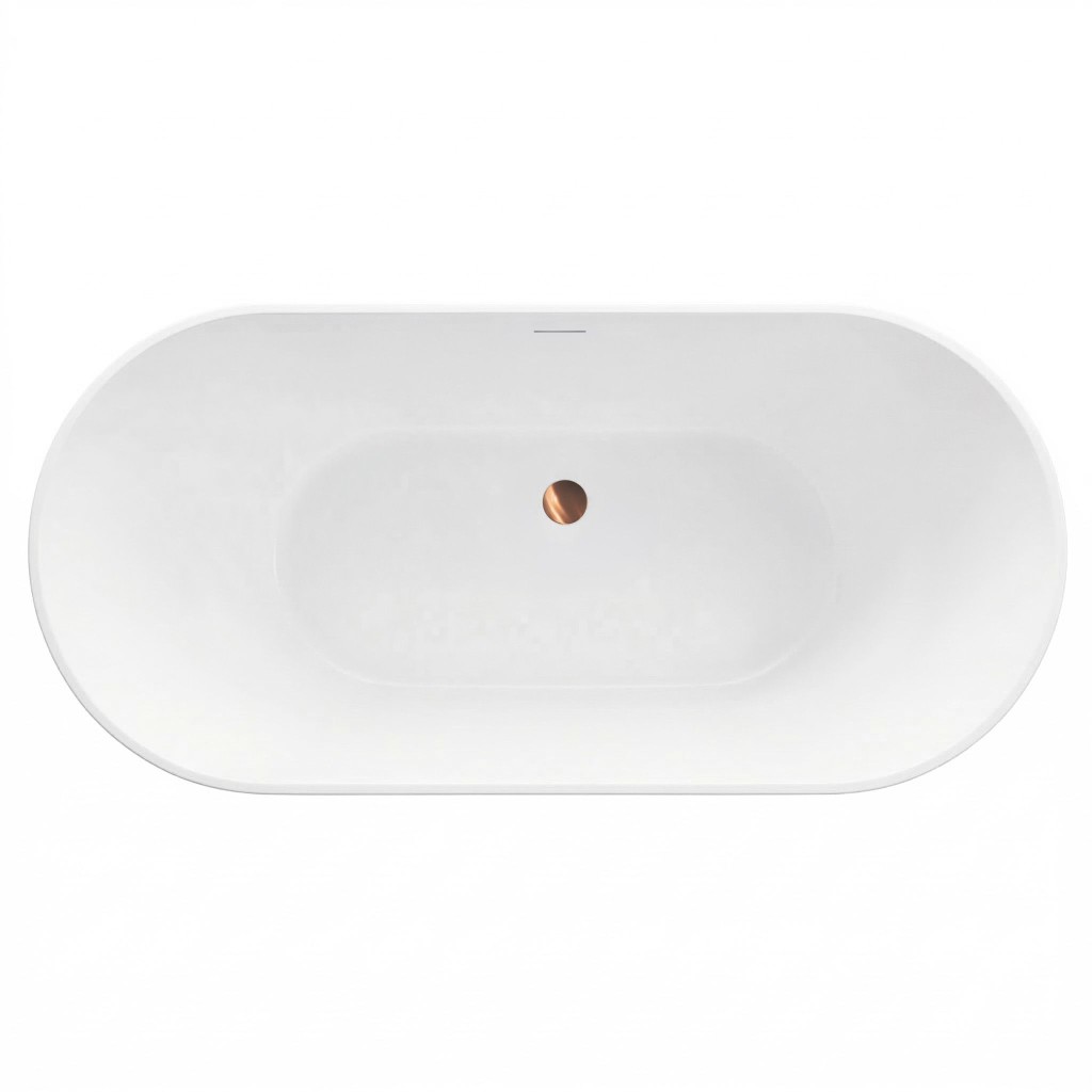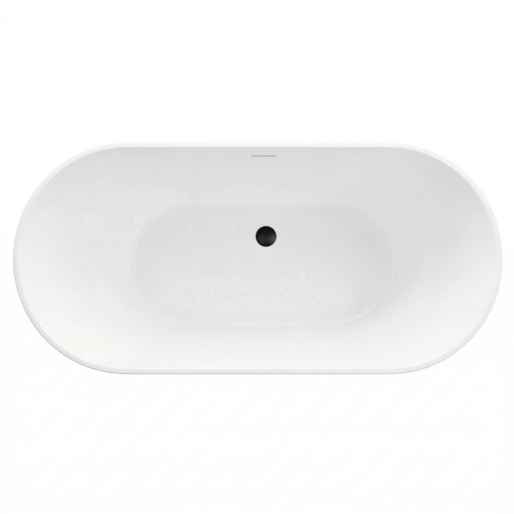 Volně stojící oválná akrylátová vana série Ferrano od výrobce REA s přepadem a umístěném odpadu na středu vany.
