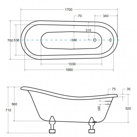 Symetricky oválná volně stojící retro vana MERANO se vyrábí ve dvou rozměrech s kovovými ozdobnými nohami ve třech barevných variantách (bílá barva, chrom, mosaz) a u rozměru 170x77 cm i dřevěné nohy. Krásná masivní vana z prvotřídního sanitárního kompozitu (akrylátu). Konstrukce vany nevyžaduje obklad ani obezdění.