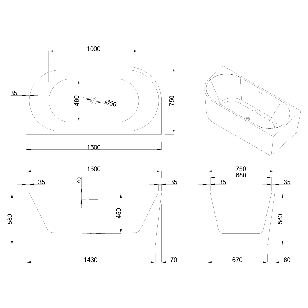 Objevte volně stojící vanu ASTRI s pravou stranou a sifonem o délce 150 cm, určenou pro moderní koupelny, kde je důležitá funkčnost, pohodlí a estetický vzhled.