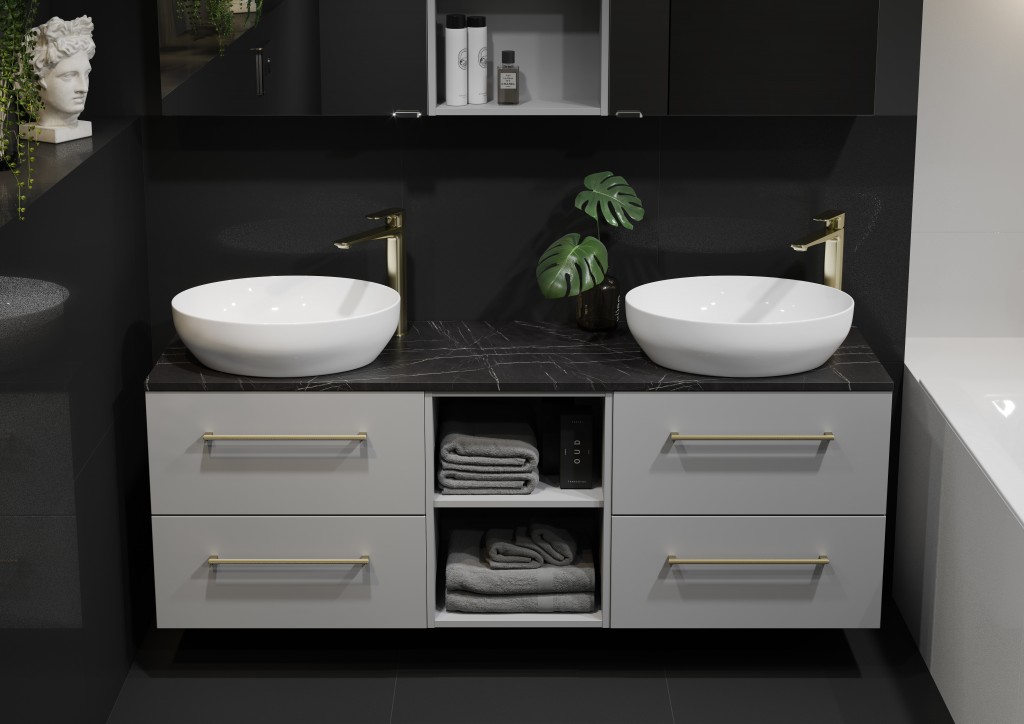 Koupelnový nábytek LARGA je dostupný ve třech barevných variantách: bílá, šedá a modrá, které lze konfigurovat s pracovními deskami různých barev. Nábytek doplňují kovové úchytky, knoflíky a nohy ve zlaté, černé a stříbrné barvě.