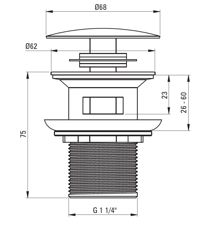 Černá umyvadlová výpusť s click-clack systémem pro umyvadla s přepadem. Výpusť má velkou zátku a je vyrobena z mosazi a slitiny zinku.