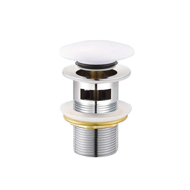 Bílá keramická zátka clik-clack s mechanismem z odolné mosazi a silikonovým těsněním. Výpust je určena do umyvadlel s přepadem a keramická zátka dokonale ladí s barvou Euro White keramiky Larga.