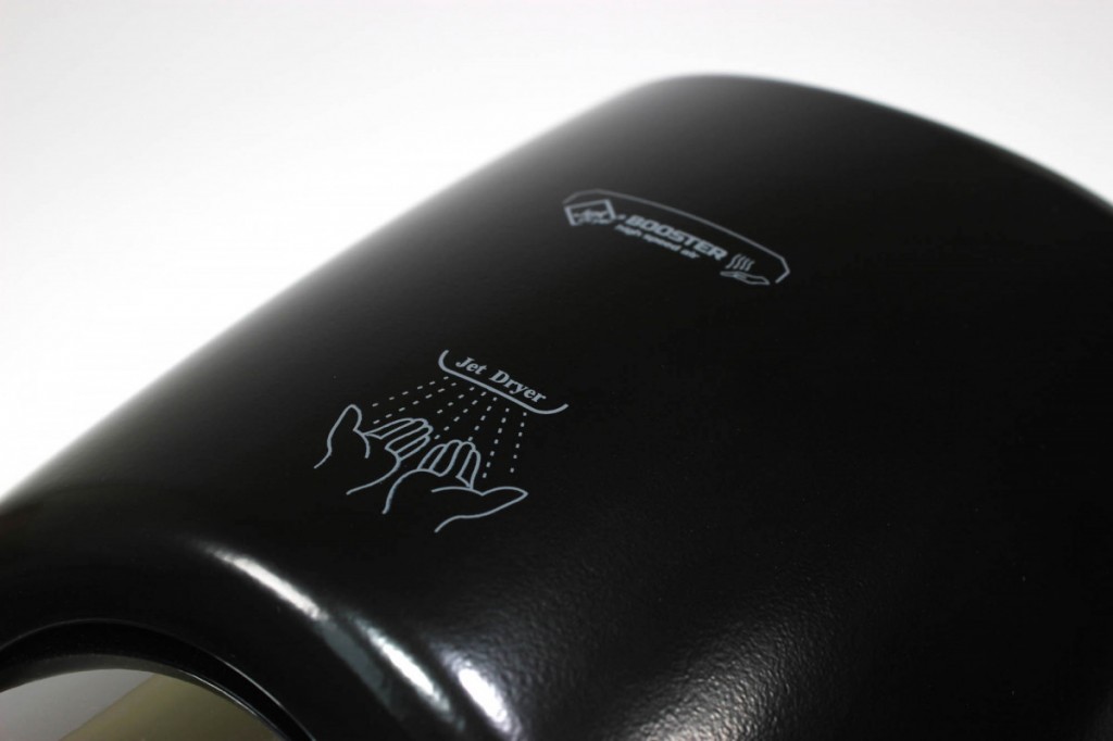 Osoušeč rukou BOOSTER se od jiných osoušečů vyznačuje výraznou pochromovanou tryskou kruhového tvaru. Díky silnému 550 W motoru je vysušení rukou velmi rychlé.