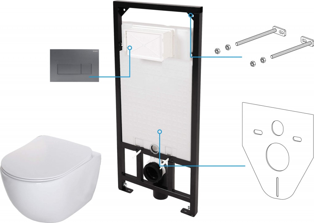 Toaletní set se závěsnou mísou byl navržen s ohledem na vysokou estetiku místnosti a snadné čištění. Odolná, vysoce kvalitní keramika nepraská a nemění barvu ani po dlouhé době používání, což potvrdily testy Deante. Univerzální, klasická bílá barva toaletního setu dodává místnosti eleganci. Vhodné pro zapuštěné instalace. Elegantní provedení ozdobí každou koupelnu. Jedná se o kompletní sadu 6v1, která obsahuje: podomítkový rám, toaletní mísu bez okraje, tiše padající sedátko, elegantní splachovací tlačítko, podložku tlumící nárazy a montážní šrouby.