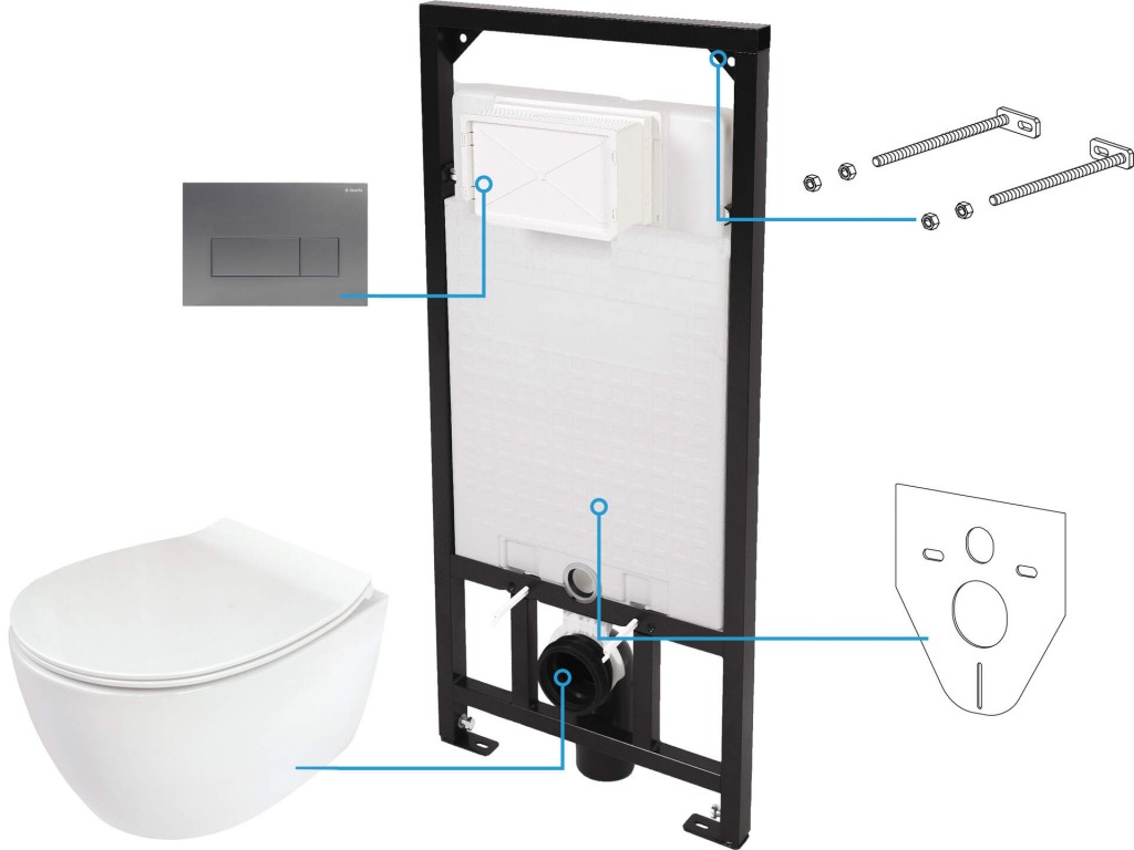 Toaletní set se závěsnou mísou byl navržen s ohledem na vysokou estetiku místnosti a snadné čištění. Odolná, vysoce kvalitní keramika nepraská a nemění barvu ani po dlouhé době používání, což potvrdily testy Deante. Univerzální, klasická bílá barva toaletního setu dodává místnosti eleganci. Vhodné pro zapuštěné instalace. Elegantní provedení ozdobí každou koupelnu. Jedná se o kompletní sadu 6v1, která obsahuje: podomítkový rám, toaletní mísu bez okraje, tiše padající sedátko, elegantní splachovací tlačítko, podložku tlumící nárazy a montážní šrouby.