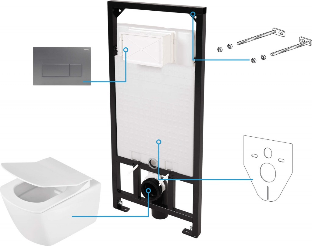 Toaletní set se závěsnou mísou byl navržen s ohledem na vysokou estetiku místnosti a snadné čištění. Odolná, vysoce kvalitní keramika nepraská a nemění barvu ani po dlouhé době používání, což potvrdily testy Deante. Univerzální, klasická bílá barva toaletního setu dodává místnosti eleganci. Vhodné pro zapuštěné instalace. Elegantní provedení ozdobí každou koupelnu. Jedná se o kompletní sadu 6v1, která obsahuje: podomítkový rám, toaletní mísu bez okraje, tiše padající sedátko, elegantní splachovací tlačítko, podložku tlumící nárazy a montážní šrouby.