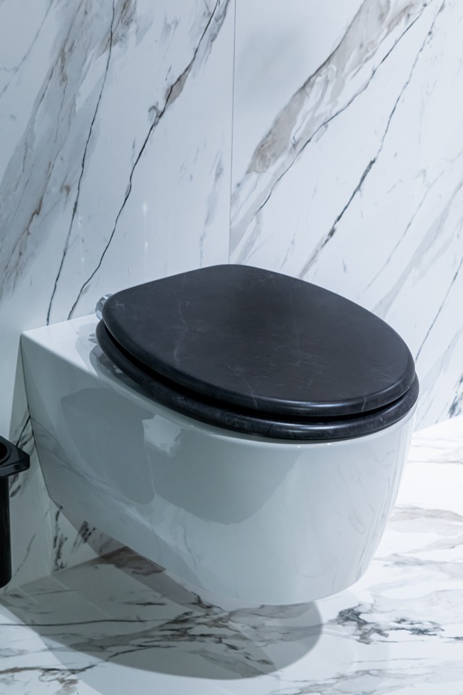 WC sedátko Arona je vyrobeno z pevné a odolné MDF desky potažené kvalitní dýhou. Na celém svém povrchu má elegantní černý mramorový vzor. WC sedátko Arona je vybaveno funkčními panty se systémem pomalého zavírání SOFT CLOSE. Univerzální záchodové sedátko, které pasuje na většinu klasických záchodových mís. Je k dispozici s instalační sadou.