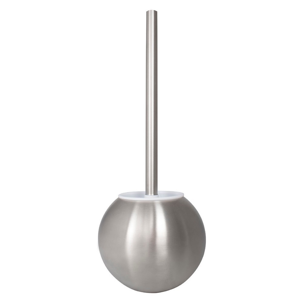 Moderní WC štětka s nádobkou ve tvaru koule. Je vyrobena z nerezové oceli se saténovým povrchem. WC štětka je vyrobena z bílého plastu.