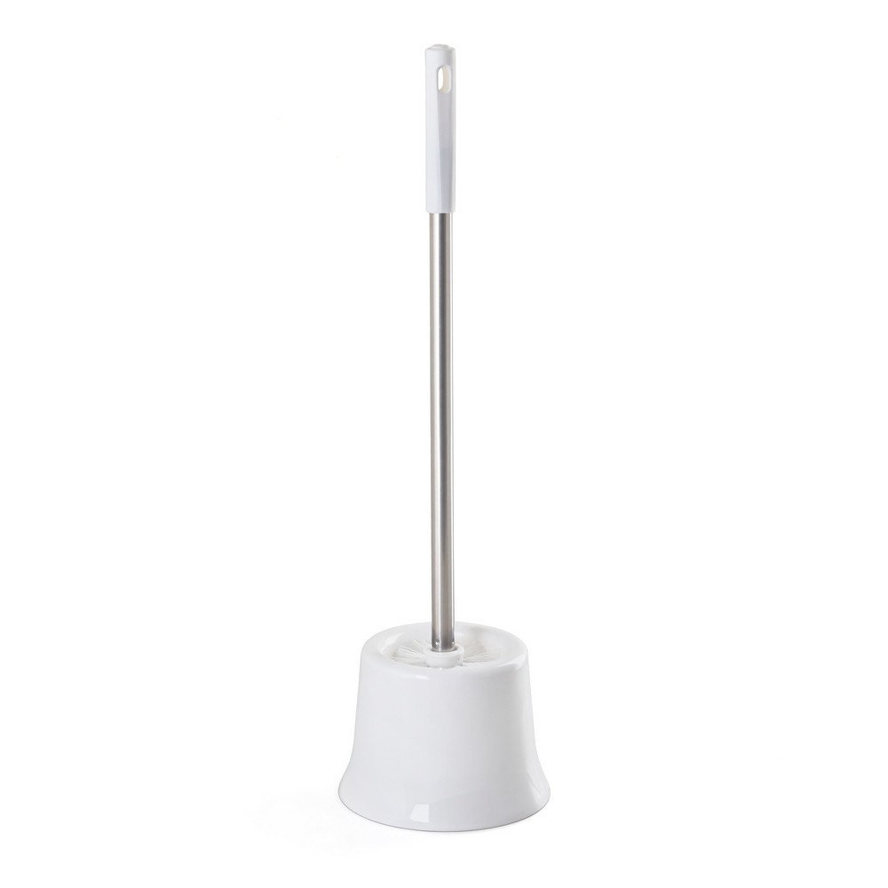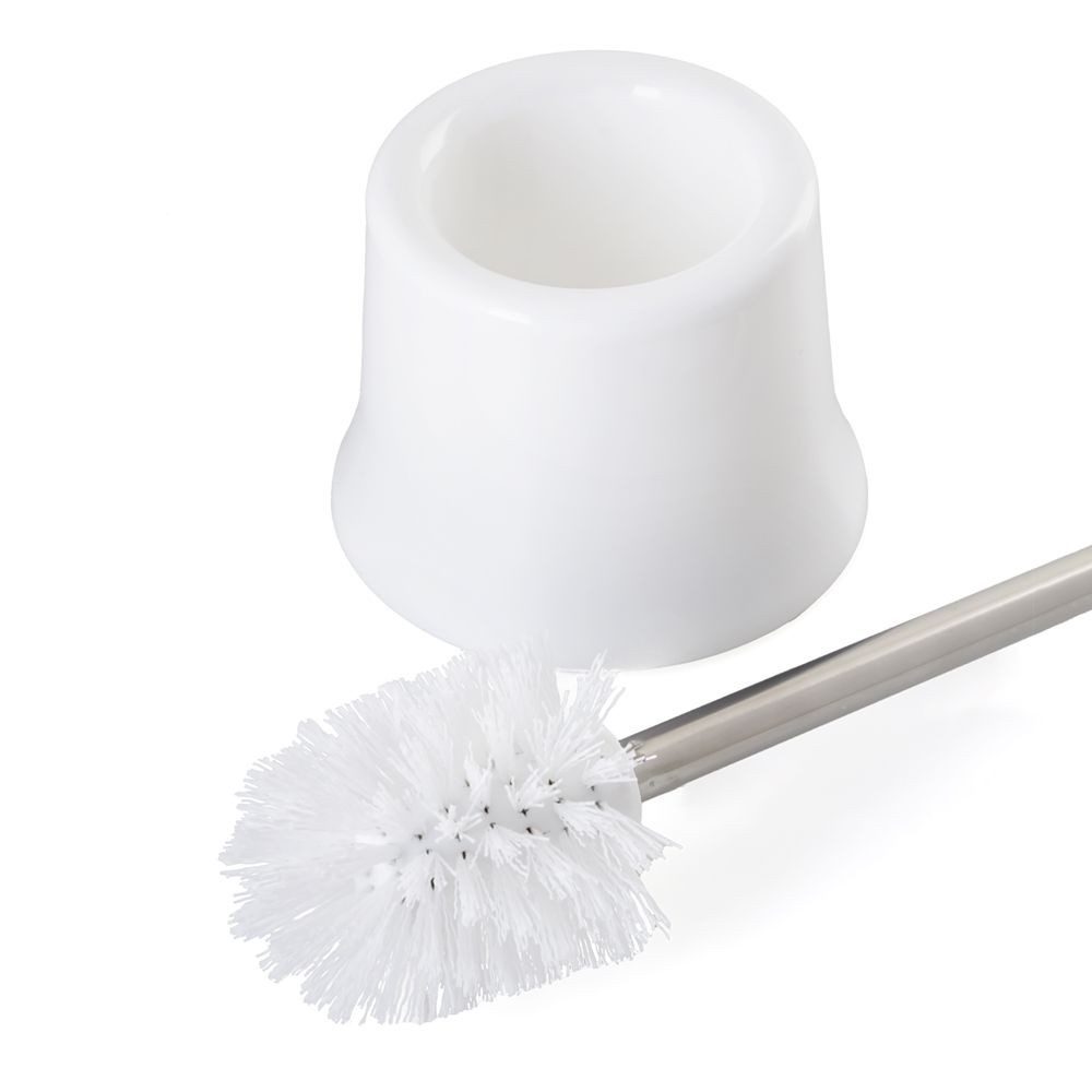 WC kartáč s plastovou nádobou v bílé barvě poskytuje praktické a estetické řešení pro udržení čistoty v koupelně. Lehká a hladká nádoba se snadno čistí a zajišťuje pohodlné používání. Čisticí hlavice kartáčku je vyrobena z hustých, plastových štětin v bílé barvě, účinně odstraňující nečistoty a usazeniny z povrchů. Průměr hlavy kartáčku je přibližně 75 mm.