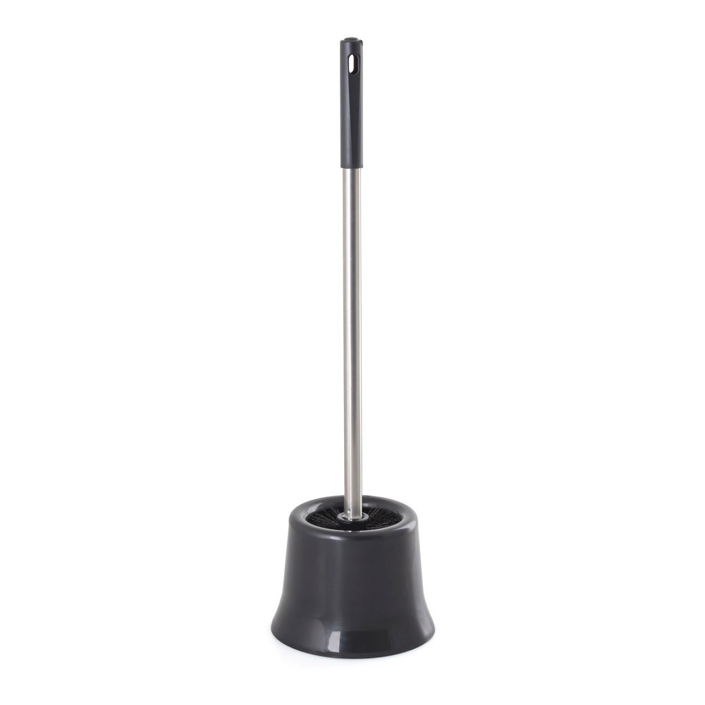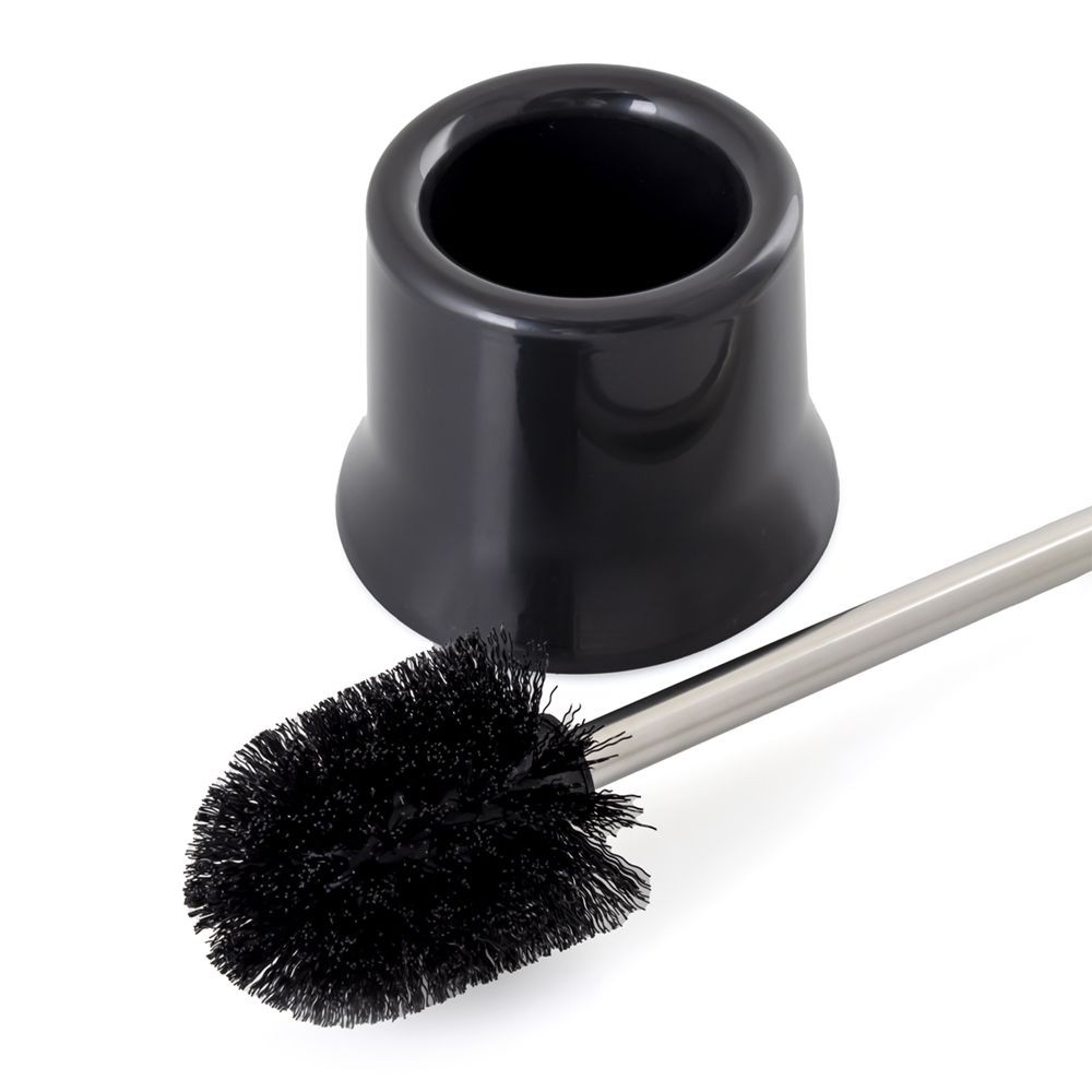 WC kartáč s plastovou nádobou v černé barvě poskytuje praktické a estetické řešení pro udržení čistoty v koupelně. Lehká a hladká nádoba se snadno čistí a zajišťuje pohodlné používání. Čisticí hlavice kartáčku je vyrobena z hustých, plastových štětin v černé barvě, účinně odstraňuje nečistoty a usazeniny z povrchů. Průměr hlavy kartáčku je přibližně 75 mm.
