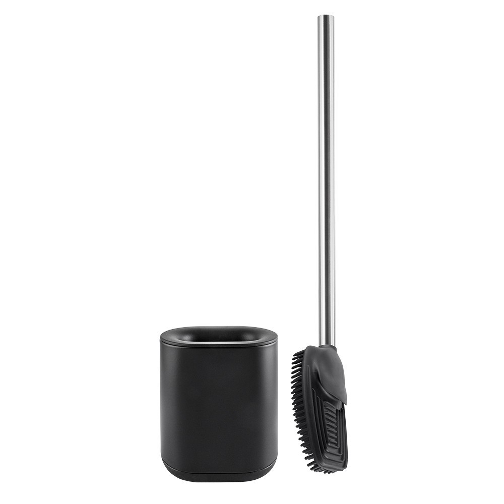 Černá WC štětka vybavená silikonovým plochým čisticím hrotem. Tento vysoce kvalitní pryžový materiál TPR výrazně usnadňuje udržování čistoty toalety. Sada obsahuje minimalistickou černou nádobu.