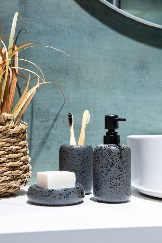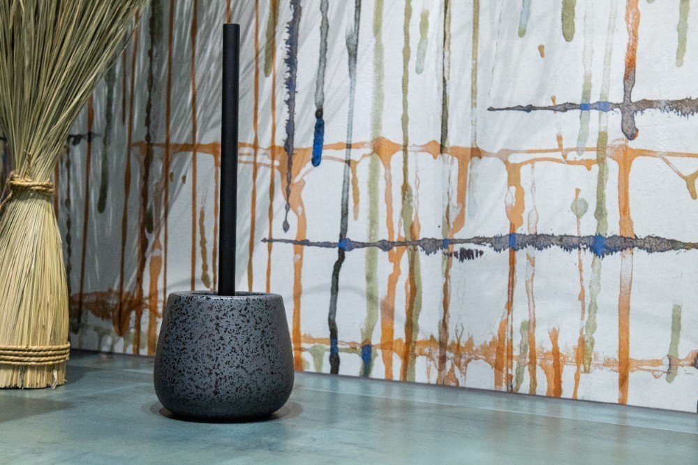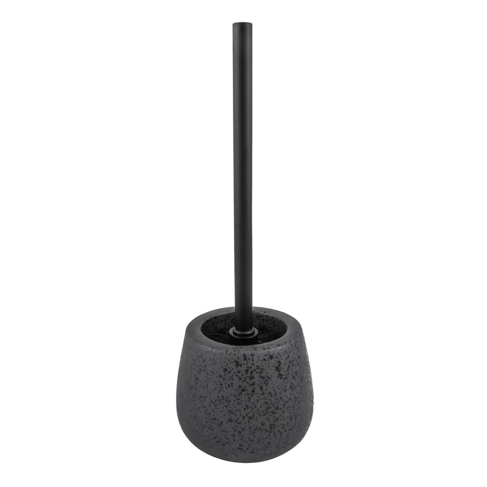 Nádoba na kartáč je vyrobena z tmavé, matné antracitové kameniny. Má nepravidelné, černé skvrny, které mu dodávají neobvyklý vzhled. Rukojeť WC štětky je vyrobena z oceli lakované černou matnou barvou, zatímco čisticí část je vyrobena z černého plastu. Průměr hlavice kartáčku je cca. 7,5 cm.