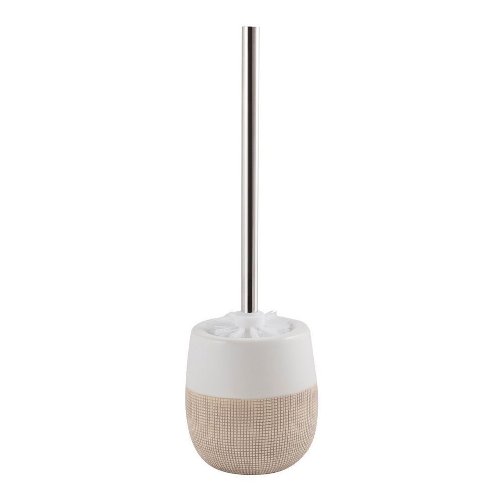 Nádoba na WC štětku je vyrobena z kameniny. Spodní část je hnědá a má drážky pro snadné uchopení, zatímco horní část má hladký povrch a je bílá.