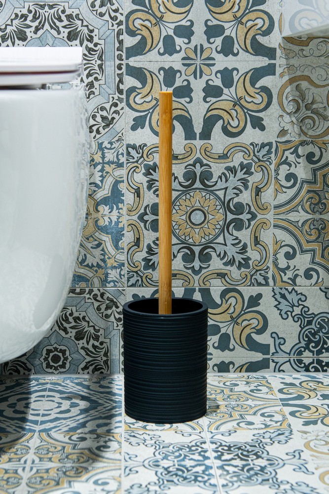 Volně stojící WC štětka kombinovaná matně černou plastovou nádobkou a štětkou s rukojetí z bambusu. Ideální doplněk do vaší koupelny v kombinaci s podobnými věšáky, držáky apod.