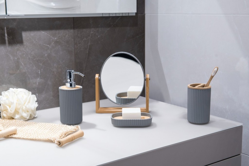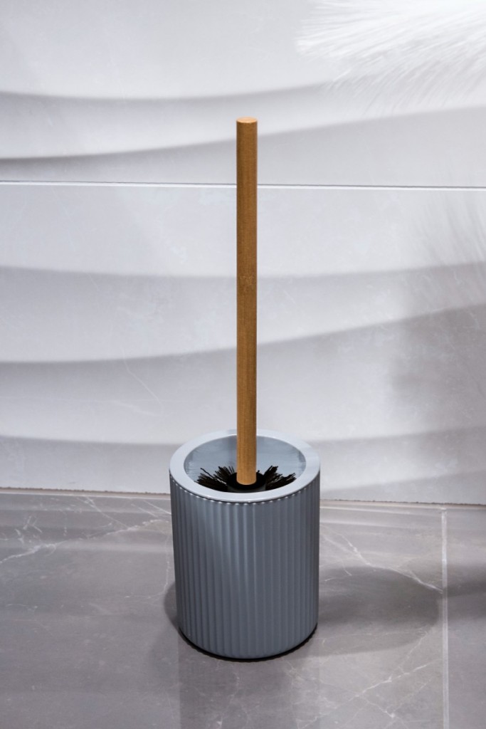 Nádobka je šedá s matným povrchem. Má texturu ve formě reliéfních svislých pruhů. Rukojeť je vyrobena z přírodního bambusu, který je módním doplňkem. WC kartáč je černý.