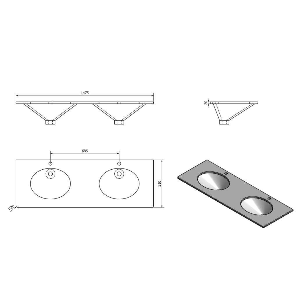 - dodáváno se dvěma keramickými umyvadly pod desku TP211 a dvěma otvory pro baterii