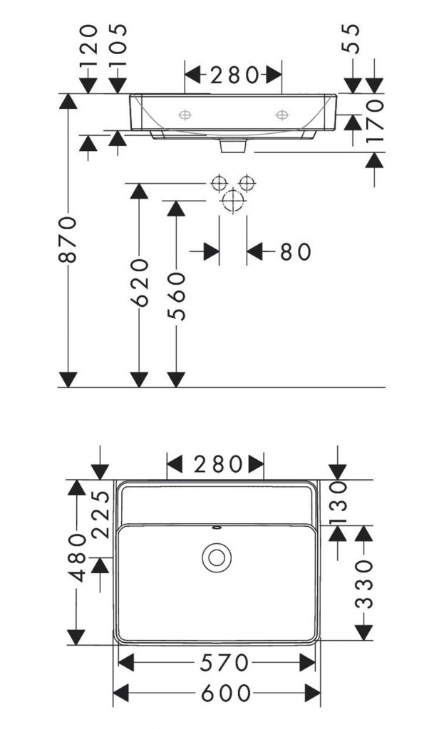 Umyvadlo zápustné na desku 600/480 bez otvoru pro baterii, s přepadem