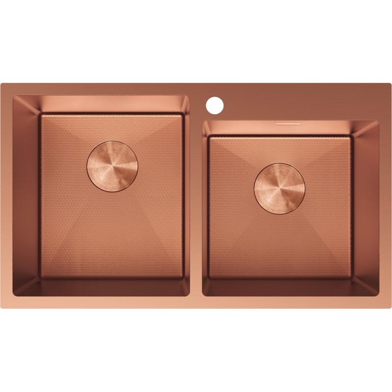 Specifikace produktu: Rozměr: 780x450x200 mm Hloubka dřezu: 200 mm Rozměry dřezu: 400x352,5 mm (větší), 352,5x350 mm (menší) Tloušťka ocelového okraje: 3 mm Tloušťka ocelového okraje dřezu: 1 mm Poloměr zaoblení rohů dřezu: R10 Průměr odtoku: ø92 mm Typ: Dvoudřezový Typ: Vestavný Materiál: Nerezová ocel AISI 304 Barva: Měď Povrch: Voština Povrchová úprava sifonu: Měď Přepadový otvor: Ano Otvor pro baterii: Ano Ruční sifon s odpadkovým košem a zátkou Přídavný kryt odtoku Skrytý přepadový otvor Zvukově izolační rohože do dřezu Odolnost vůči nárazům, poškrábání a změně barvy Odolnost vůči vysokým teplotám a tepelným šokům Snadno čistitelný povrch