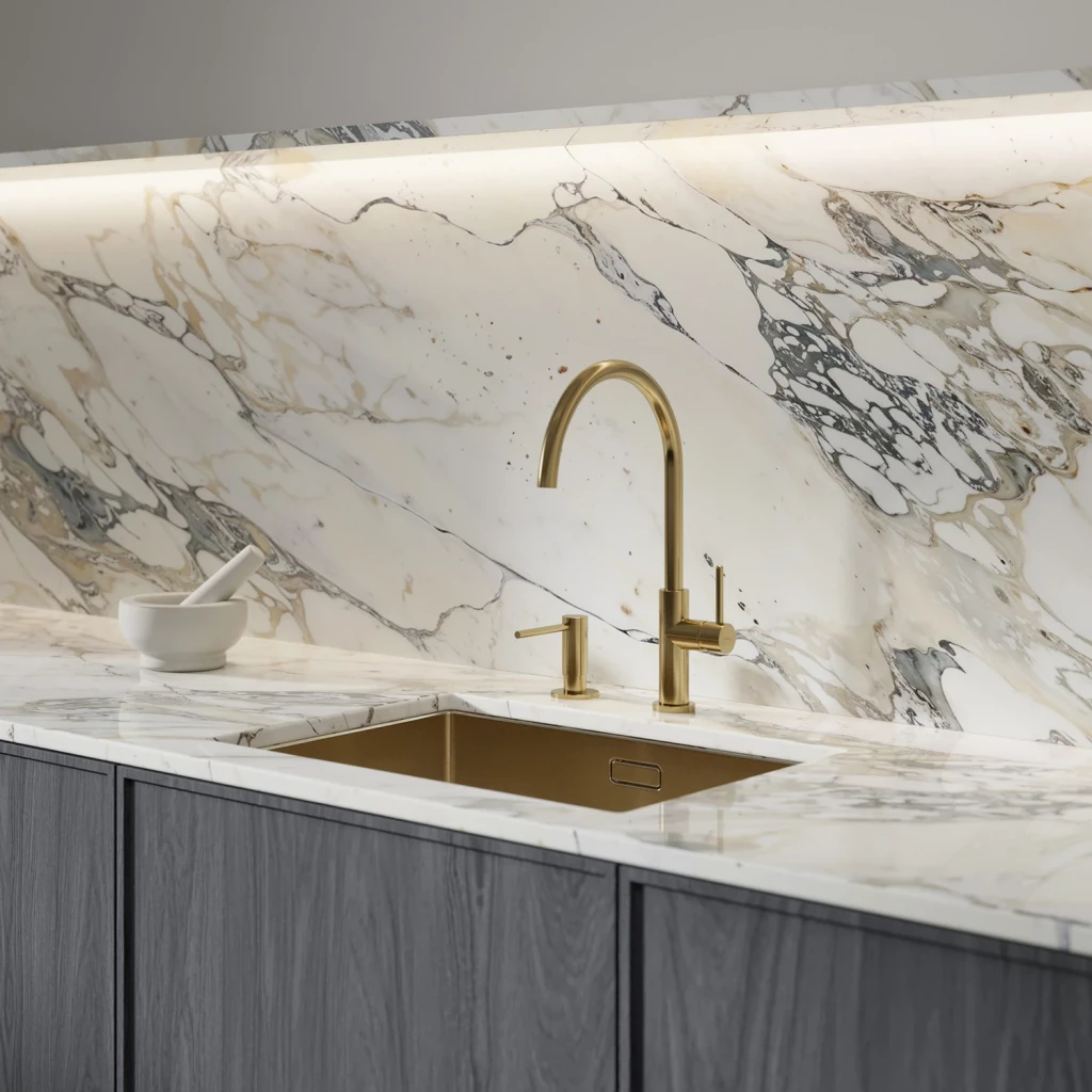 Tato dřezová baterie je dostupná v barevných variantách: kartáčovaná mosaz, černá, zlatá, kartáčované zlato, chrom, grafit, měď, a staro měď.