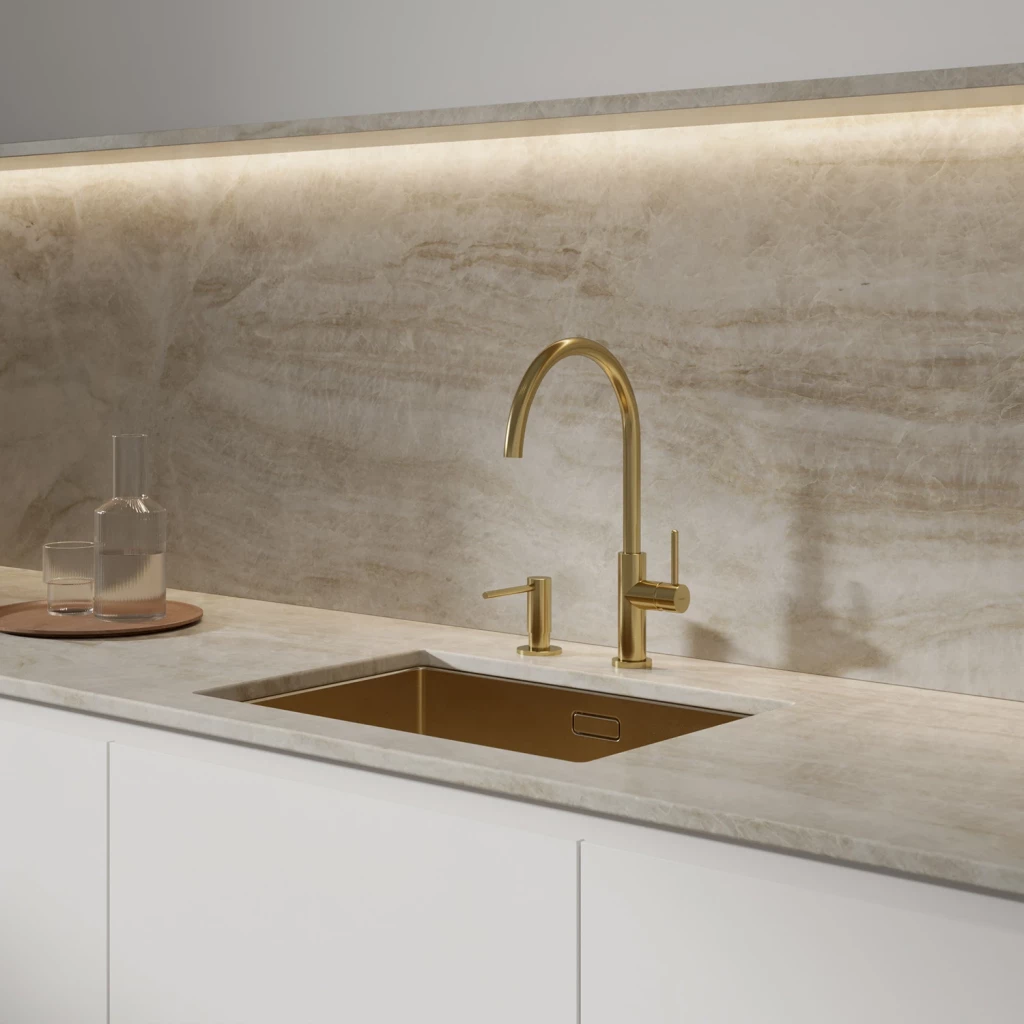 Tato dřezová baterie je dostupná v barevných variantách: kartáčovaná mosaz, černá, zlatá, kartáčované zlato, chrom, grafit, měď, a staro měď.