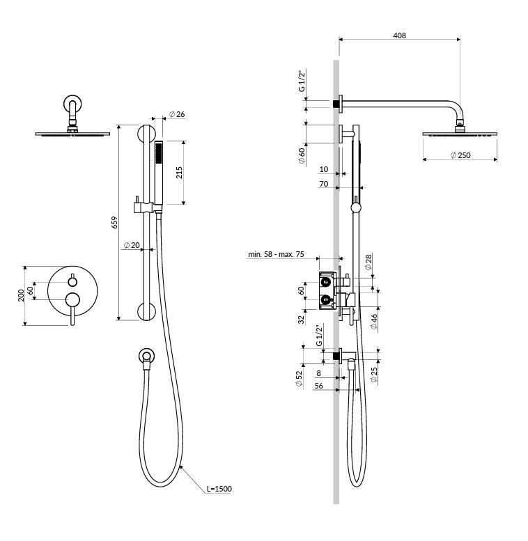 - dešťová sprcha s ramenem (WGSET1WM), mosaz, rozměr: ø25 cm, dosah od zdi: 41 cm