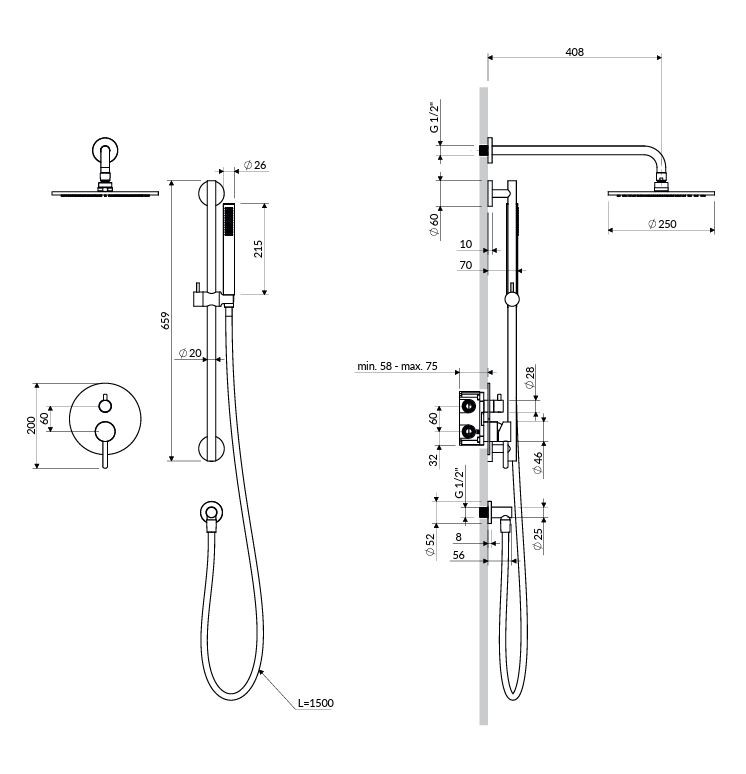 - Dešťová sprcha s ramenem ( WGSET1BSB ), mosaz, rozměr: ø25 cm, dosah od zdi: 41 cm