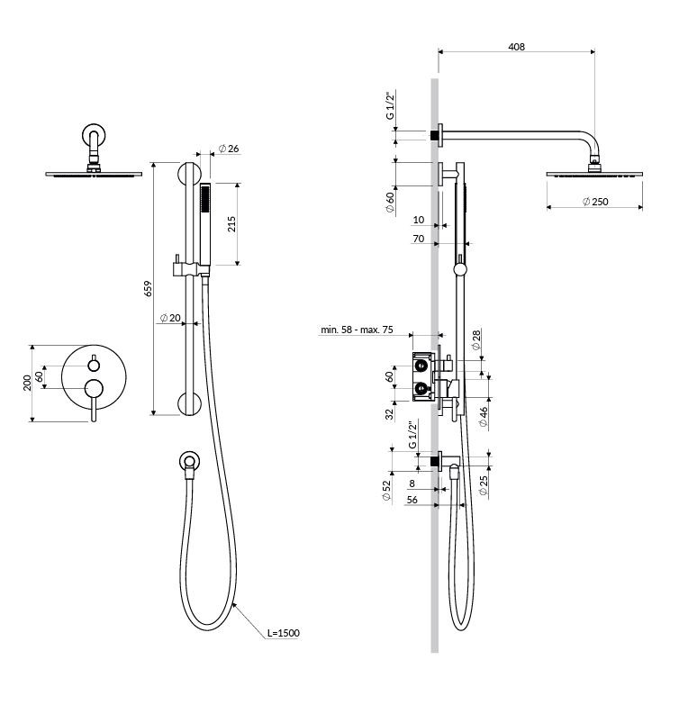 - Dešťová sprcha s ramenem ( WGSET1NI ), mosaz, rozměr: ø25 cm, dosah od zdi: 41 cm