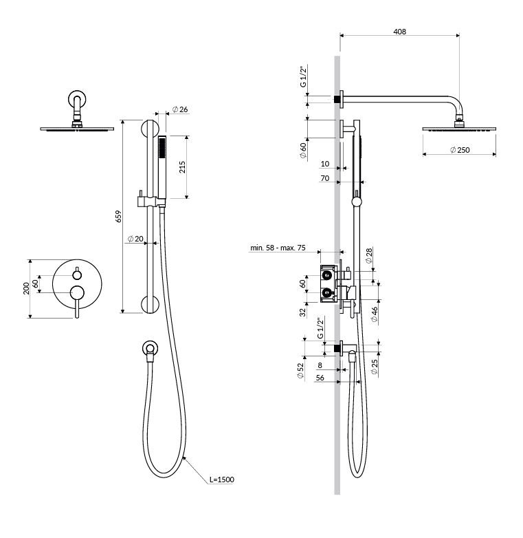 - Dešťová sprcha s ramenem ( WGSET1CP ), mosaz, rozměr: ø25 cm, dosah od zdi: 41 cm