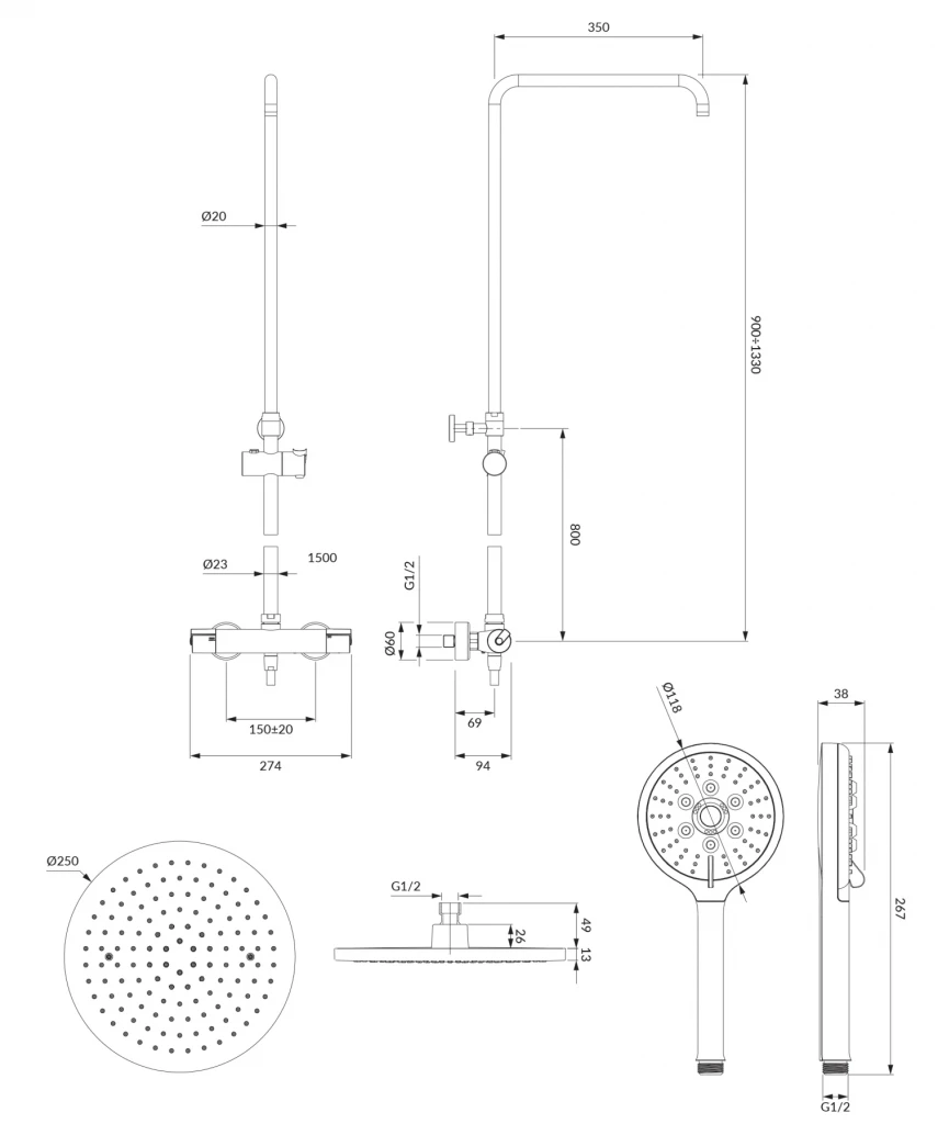 - dešťová sprcha (WGR125CR), rozměr: ø25 cm, dosah od zdi: 43 cm