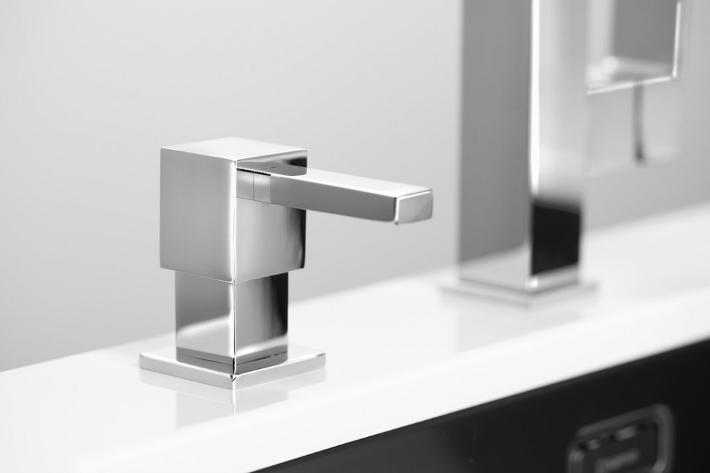 Zápustný dávkovač mýdla a saponátu s možností instalace do umyvadla místo stojánkové baterie, nebo do desky vedle umyvadla či dřezu.