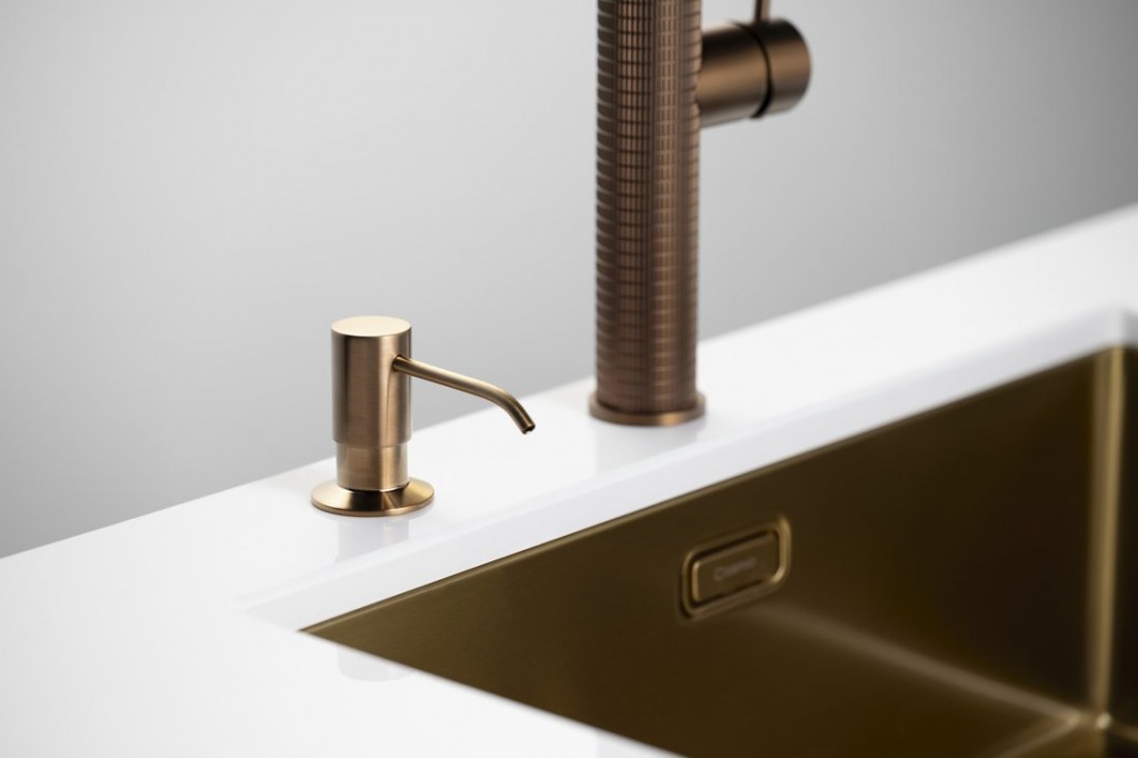 Zápustný dávkovač mýdla a saponátu s možností instalace do umyvadla místo stojánkové baterie, nebo do desky vedle umyvadla či dřezu.