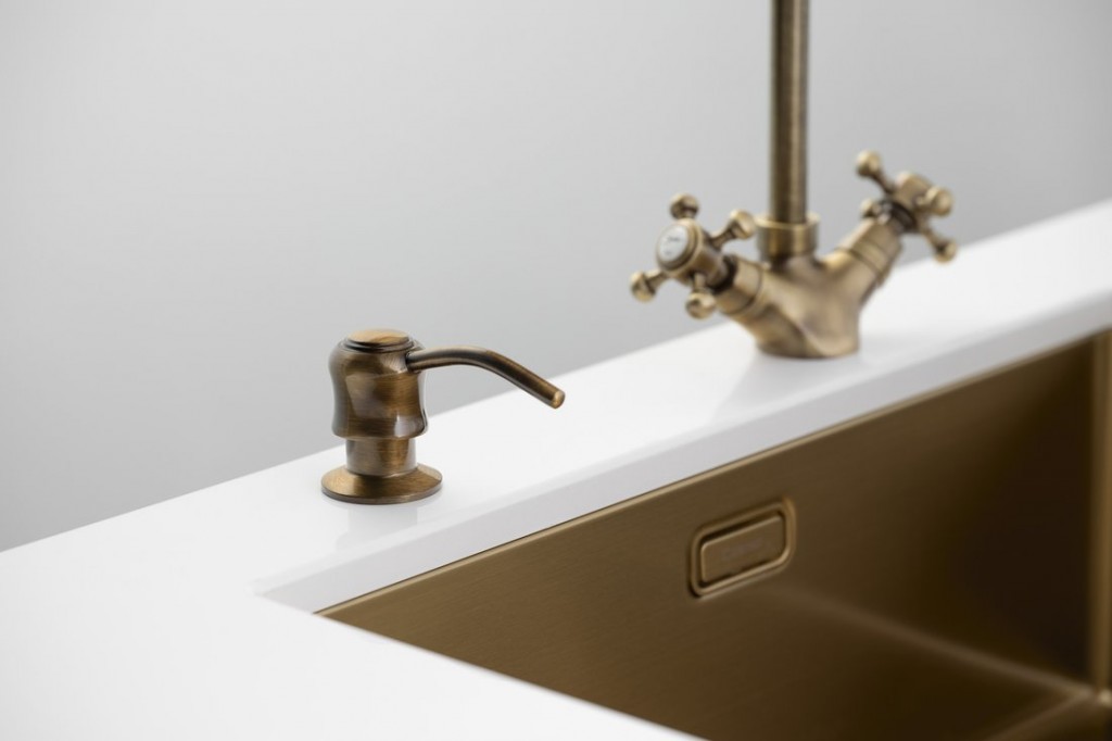 Zápustný dávkovač mýdla a saponátu s možností instalace do umyvadla místo stojánkové baterie, nebo do desky vedle umyvadla či dřezu.