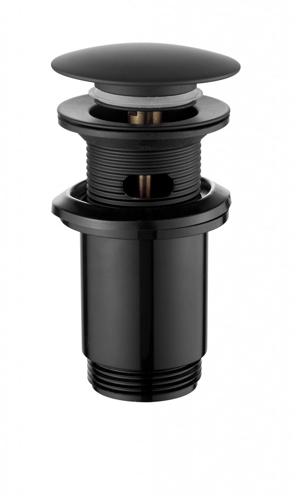 Univerzální mosazná zátka klik-klak /uzavírání a otvírání pomocí stisku horní zátky/ v černém provedení. Je určena k zakrytí umyvadlového odpadu.
