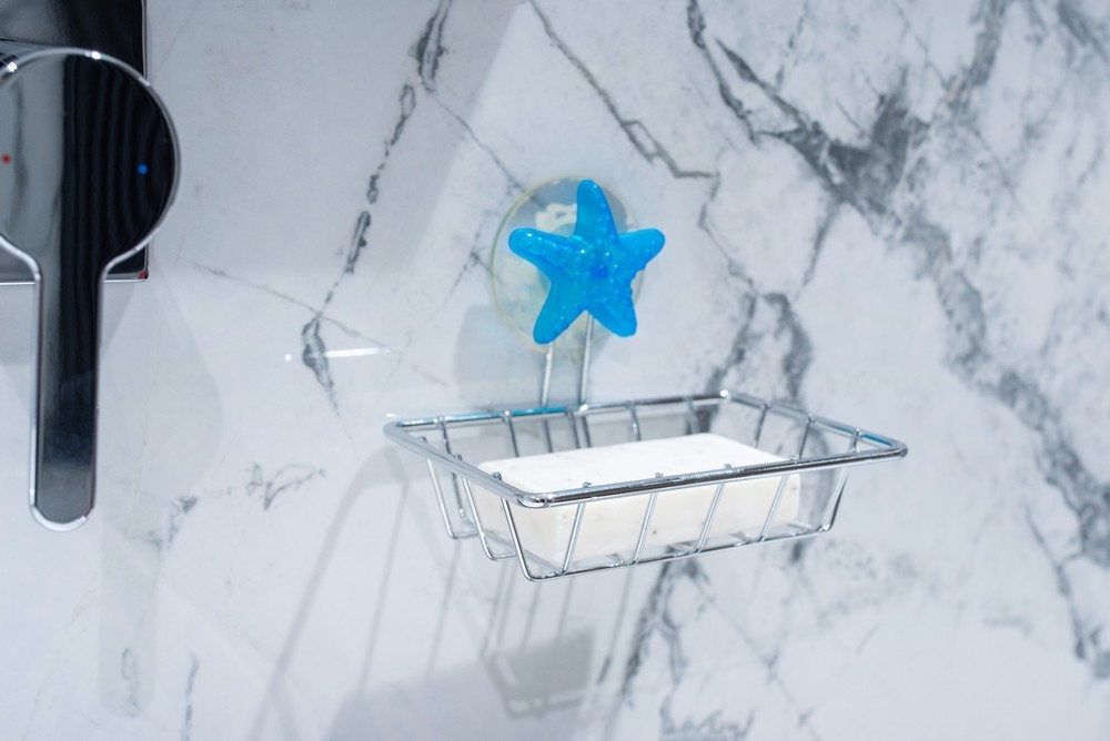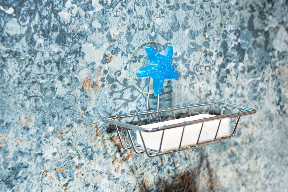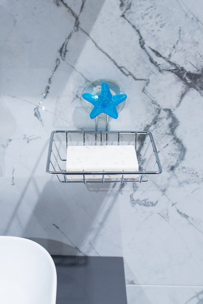 Miska na mýdlo z pochromovaného kovu. Instalace pomocí přísavky s ozdobnou modrou hvězdou.