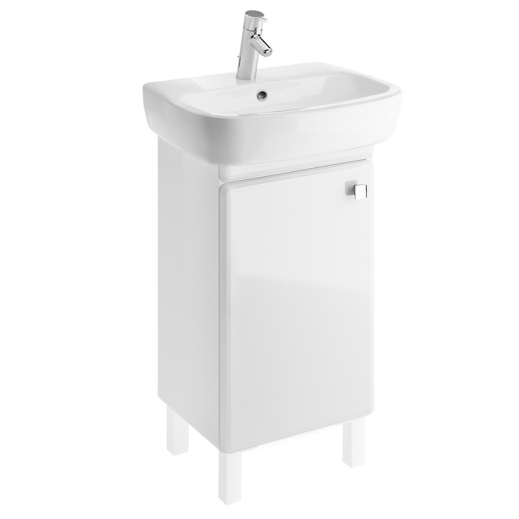 Závěsná umyvadlová skříňka IBU bílé barvy s lesklým povrchem, doplněna stříbrným madlem. Dvířka mají univerzální montáž pravá/levá. SKříňku lze instalovat na stěnu nebo s nožičkami, které nejsou součástí a lze je doobjenat níže v souvisejícím zboží.