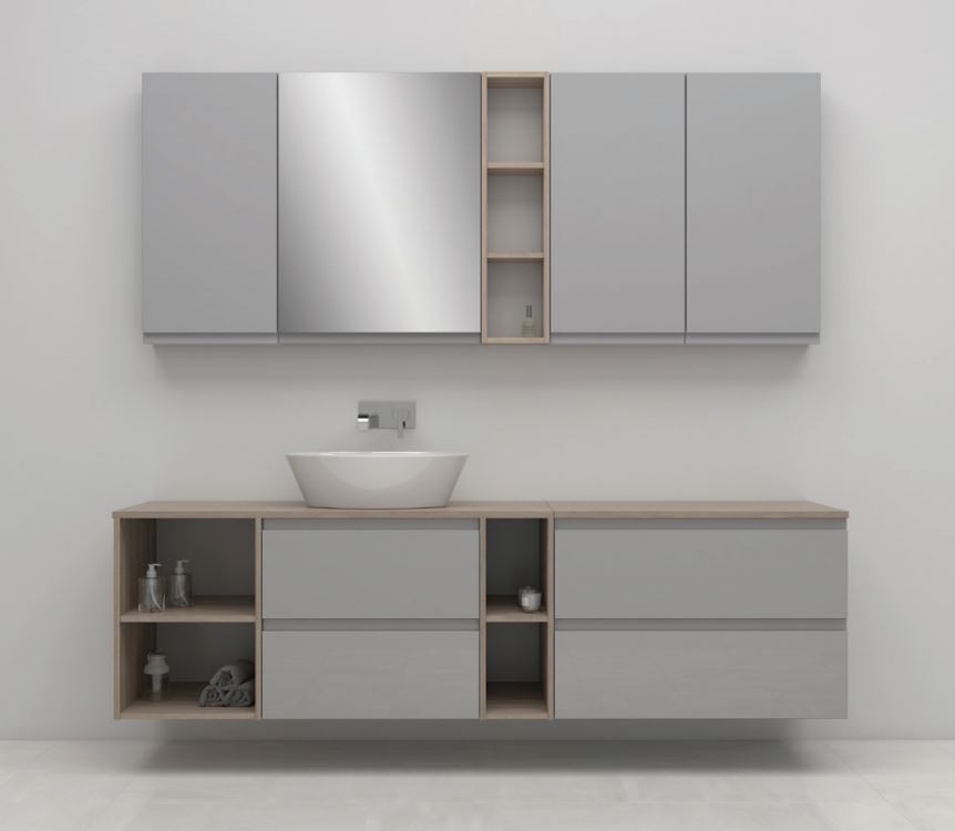 Závěsná skříňka MODUO SLIM s univerzálním otvíráním dvířek pravá/ levá, je menší hloubky než standardní skříňky a je příkladem moderního koupelnového nábytku. Dvířka jsou se skrytým úchytem a tělo skříňky je pokryto lesklým šedým lakem, uvnitř jsou dvě elegantní skleněné police. Dvířka jsou vybavena tichým zavíracím systémem.