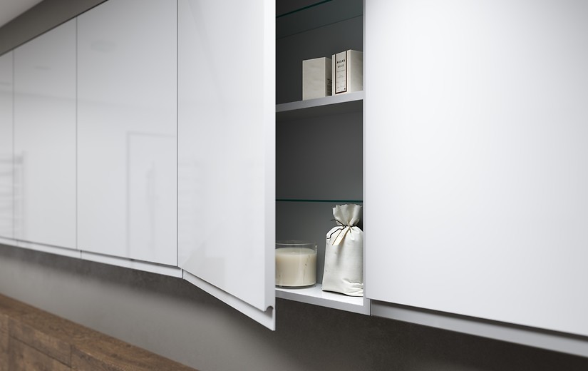 Přídavná horní skříňka MODUO SLIM s univerzálním otvíráním dvířek pravá/ levá, je menší hloubky než standardní skříňky a je příkladem moderního koupelnového nábytku. Přední část dvířek se skrytým úchytem a tělo skříňky je pokryto lesklým šedým lakem, uvnitř jsou dvě elegantní skleněné police. Dvířka jsou vybavena tichým zavíracím systémem.