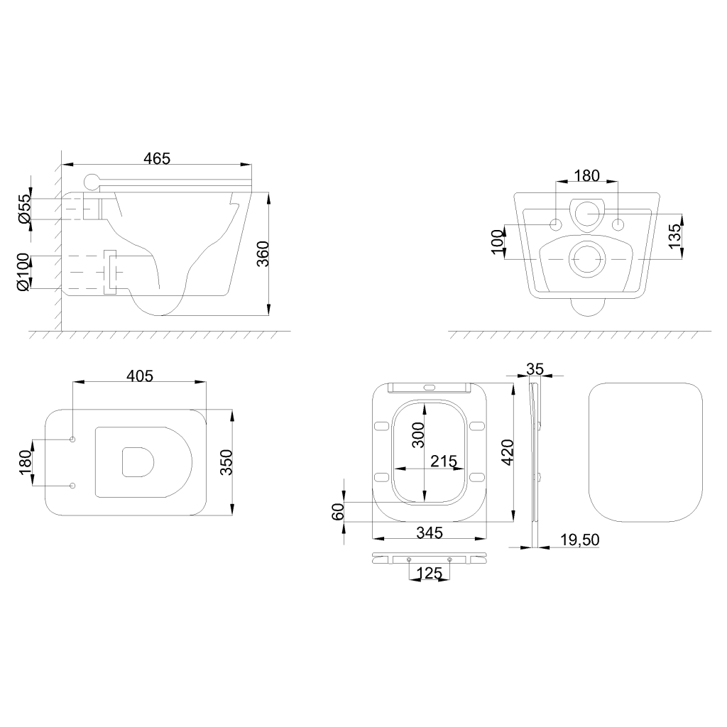 Závěsná klozetová mísa čtvercového tvaru PAROS v jedné rovině se stěnou v bílém provedení. Součástí mísy je sedátko se systémem soft-close.